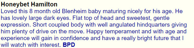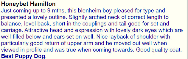 1st Puppy, Best Puppy Dog and Reserve Best Puppy in Show Northern CKCS Society Championship Show judged by Elaine Berwick
